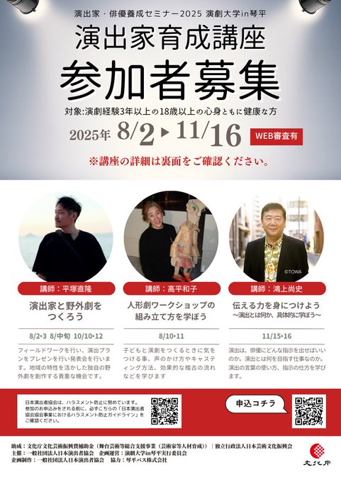 【求む、演出家】演出を今後もやっていきたいという方、演出家としてもっとスキルを磨きたいという方へのご案内です演出家•俳優養成セミナー2025『演劇大学in琴平』参加者募集演出家育成講座となっております..