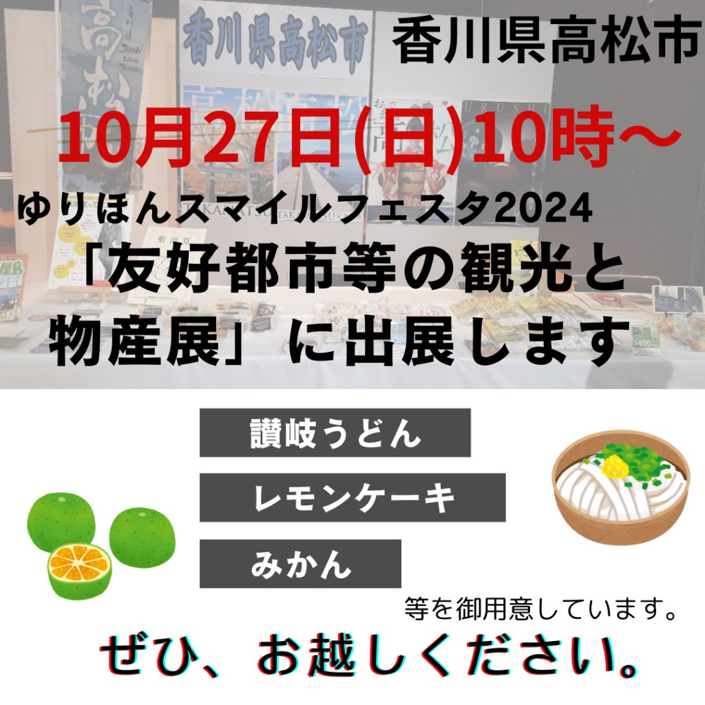 ゆりほんスマイルフェスタ2024「友好都市等の観光と物産展」に出店します日時:10月27日(日)午前10時~場所:秋田県由利本荘市文化交流館「カダーレ」#讃岐うどんや#みかん等を販売します。#秋田県由..