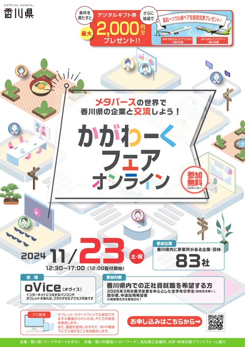 ╭━━━━━━━━━━━╮「かがわーくフェア」って?╰━━━━━v━━━━━╯香川県に特化した就活情報に触れ、自分の潜在的な就活ニーズにも気づけるオンライン就活イベントです!★高松-ソウルペアチケット..