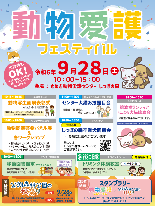 /動物愛護フェスティバル&さぬき動物愛護センター開設5周年記念セレモニー9/28開催\犬猫譲渡会やトリミング体験教室など楽しいイベント盛りだくさんまた公渕森林公園の秋祭りとコラボしたスタンプラ..