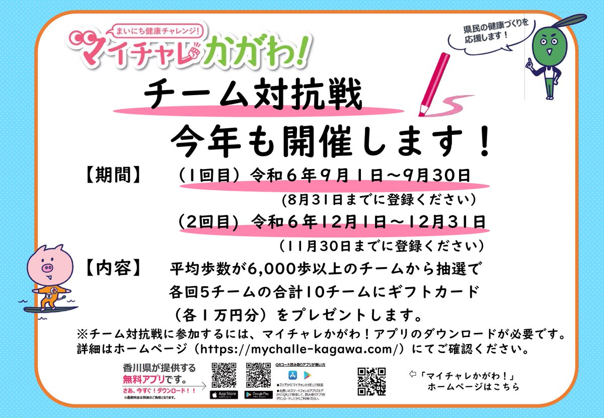 【#募集情報】香川県の健康アプリ「マイチャレかがわ!」では、9月1日~30日の間「チーム対抗戦」を開催します。チームの1日の平均歩数が6000歩以上になったチームの中から、抽選でギフトカード(1万円分..