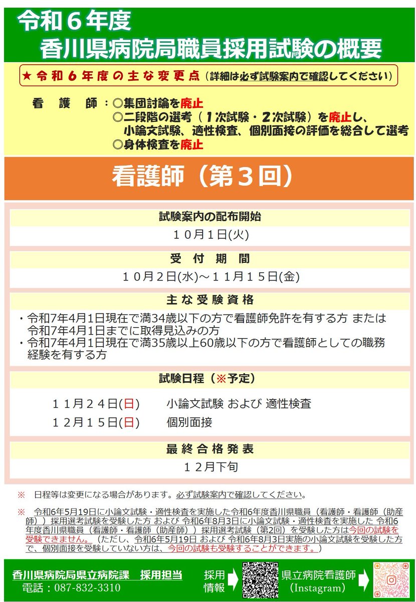 【#試験情報】今年度の看護師、看護師(助産師)採用選考試験(第3回)の実施予定をお知らせします。日程等はあくまで予定ですので、詳細は必ず、10月1日(火曜日)に公表予定の試験案内でご確認ください。▼詳..
