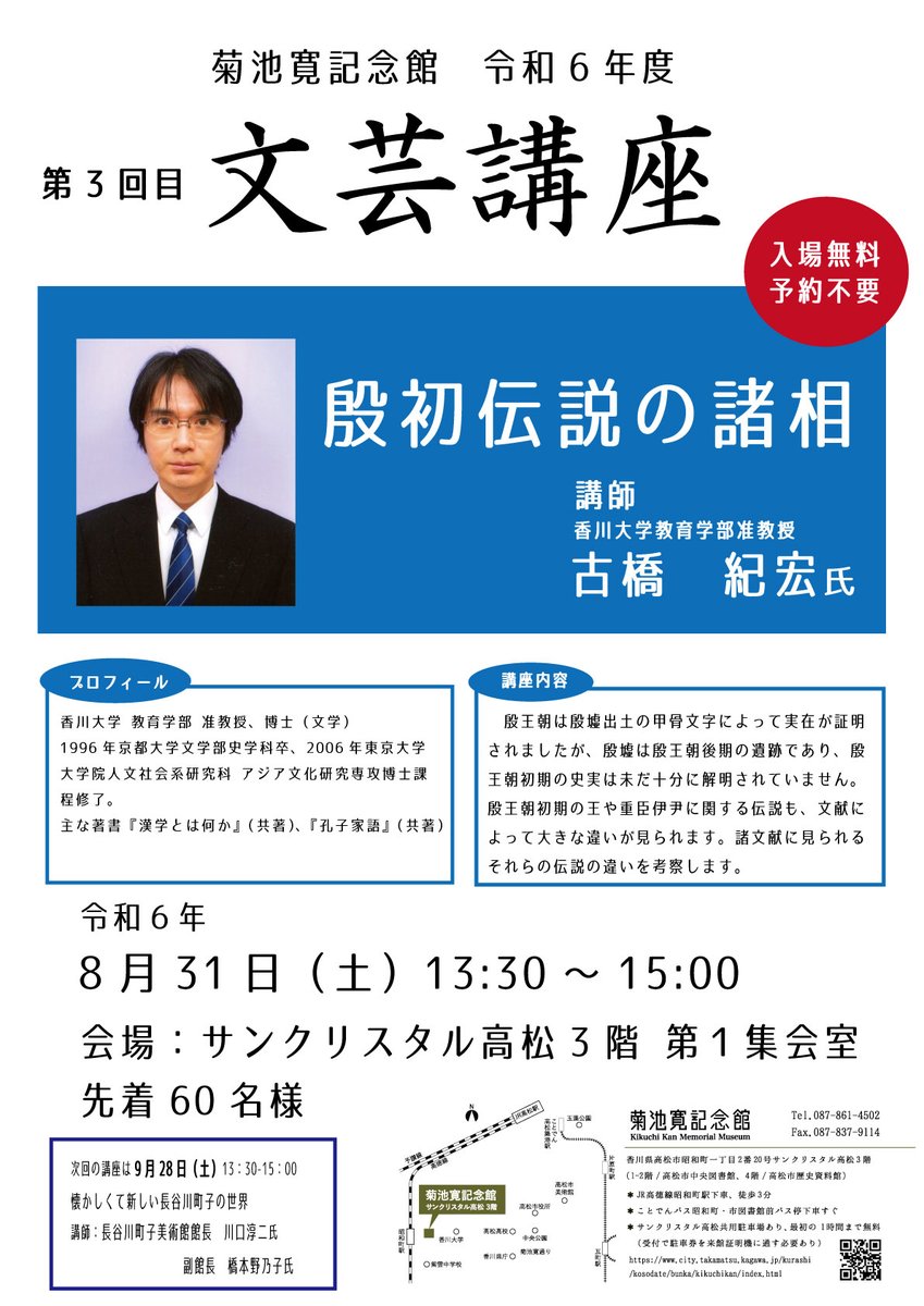 #菊池寛記念館よりお知らせ明日8月31日に開催を予定していた文芸講座「殷初伝説の諸相」(講師:古橋紀宏氏)は台風接近のため、3月29日に延期します。なお、菊池寛記念館の開館情報につきましては、お電話(..
