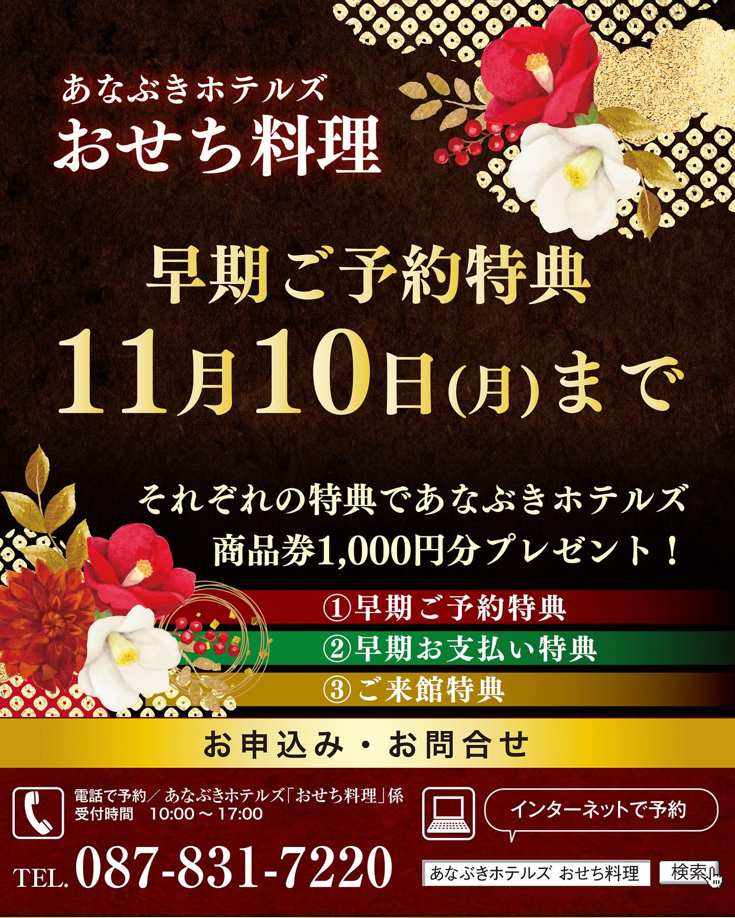 おせち料理ご予約受付中!まもなく早期ご予約特典の締切が近づいています。各特典ごとに、ホテルレストランやケーキなどテイクアウトで使える「あなぶきホテルズ商品券1,000円分」をプレゼント💫しておりま..