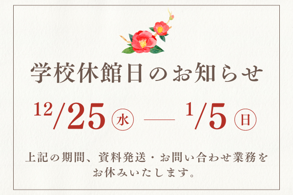 【学校休館日のお知らせ】2024年12月25日(水)~2025年1月5日(日)まで資料発送・お問い合わせ業務をお休みいたします。※在校生の登校についてはこの限りではありませんのでクラス担任等に確認して..