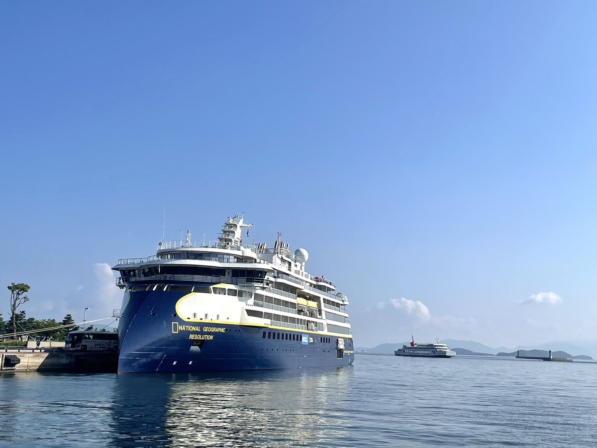 おはようございます!#サンポート高松にこんな大きな船が!ナショナル・ジオグラフィック・レゾリューション(12,786t)南極にもいける探検#クルーズ船だとーーー乗客の多くがサイクリングツアーへ出かけて..