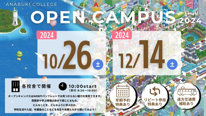 アナトラにゃう。#穴吹カレッジ10・12月の#オープンキャンパススケジュールを紹介するにゃ!高校1・2年生のみんにゃは、今の時期から進路研究ができるビッグチャンスにゃ!5日前までに予約して参加すると、..