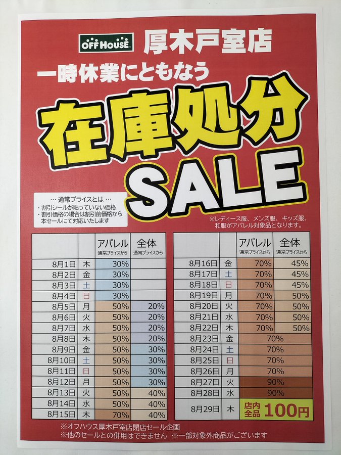 一時休業にともなう在庫処分セール開催中!!!!8/8までアパレルは50%OFF、他全品20%OFFでご提供中!!!!
