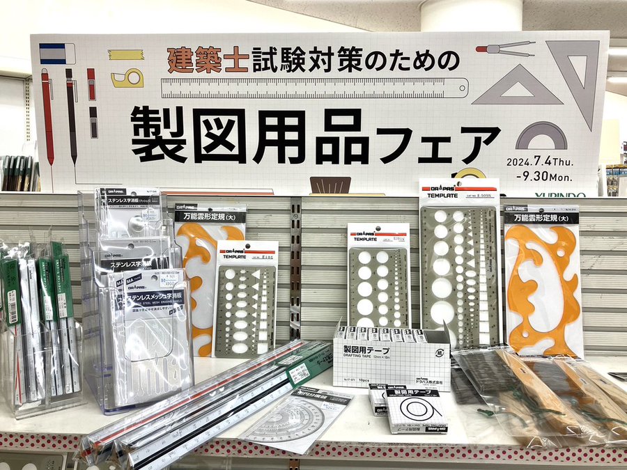 4F【フェア】「製図用品フェア」アクリル製の定規、分度器、ブラシ三角スケール、テンプレートなどなど建築士試験対策のための製図用品フェアです。ゼブラの製図用シャープペンシル『テクトツゥーウェイ』や『グラ..
