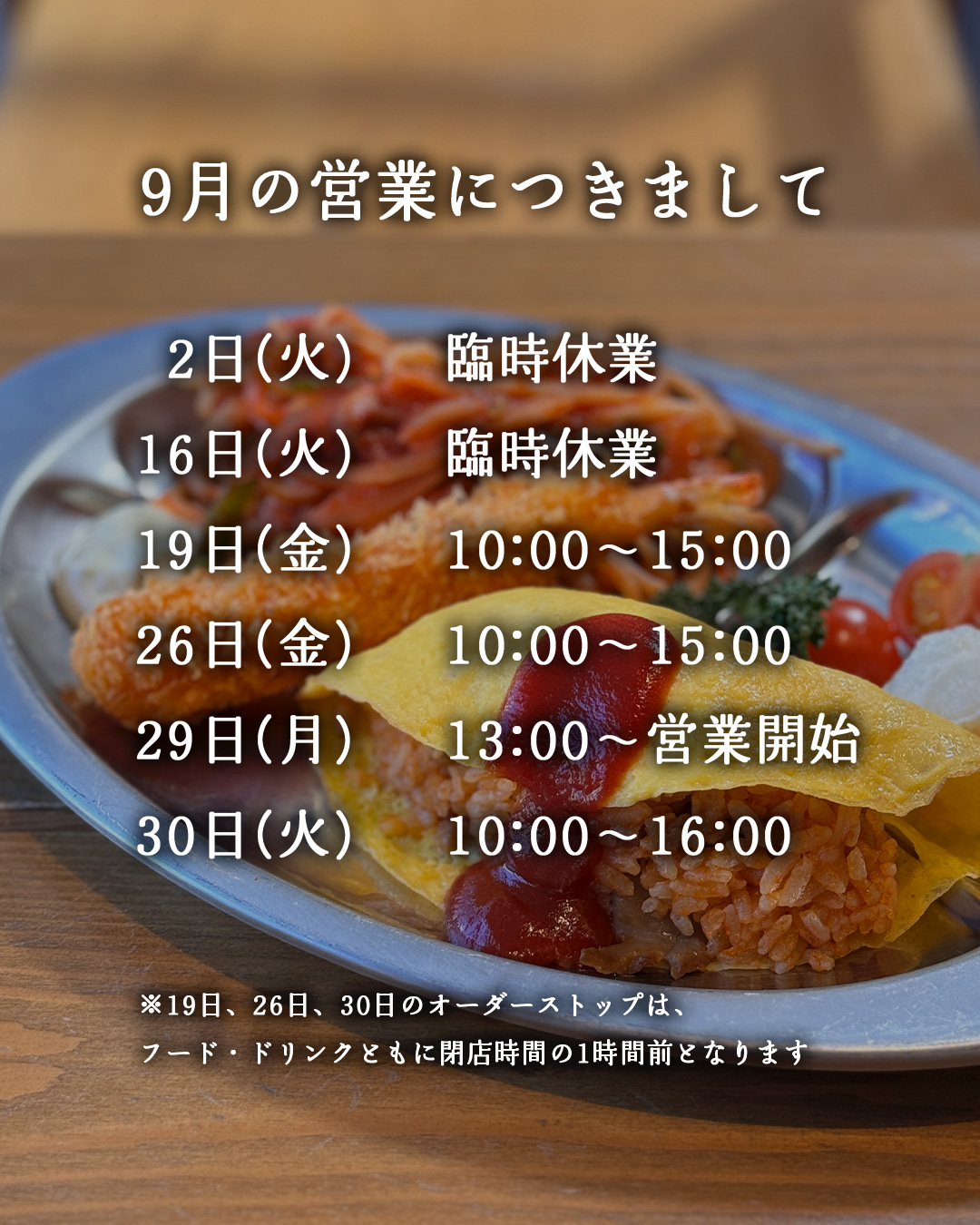 残暑厳しい日が続きますが、もうすぐ8月も終わり…🫠☀️来月の臨時休業・営業時間変更をご案内します!˗ˏˋ9..