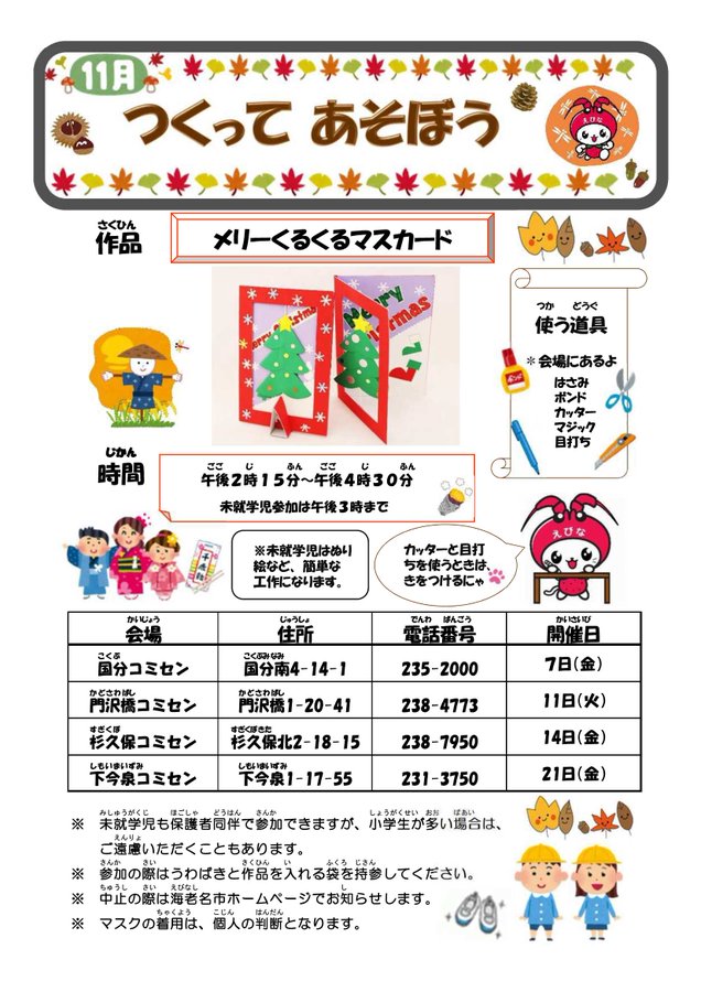 【つくってあそぼう】小学生を対象に社会教育支援指導員が一緒に工作をしています。11月は「メリーくるくるマスカード」を作ります。上履きと作品を持ち帰る袋を持参してください。また、簡単に楽しくできる工作を..