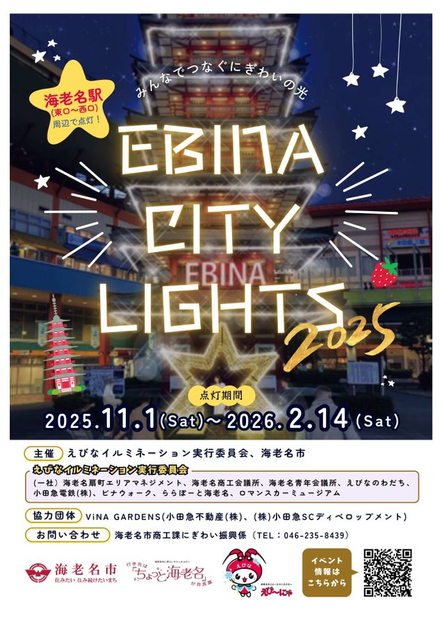 【EBINACITYLIGHTS2025】海老名駅の東西をイルミネーションでつなぐ「EBINACITYLIGHTS2025」を開催します。今年は、海老名中央公園をメインに七重の塔のイルミネーションの復..