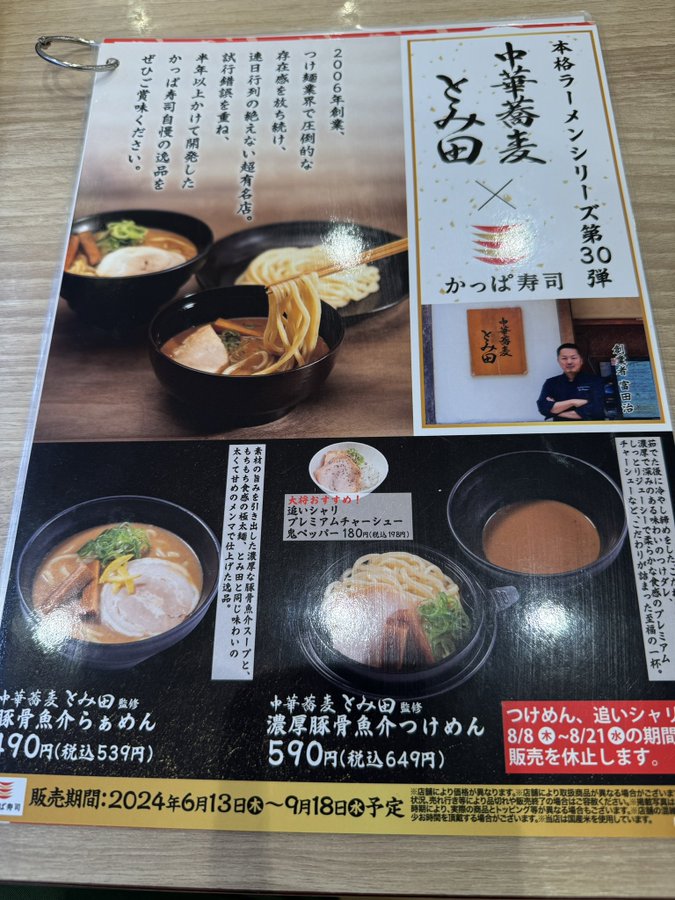 本日 11時30〜ラスト( Lo21時) らーめん3種類、汁無し 明日 11時30〜ラスト (Lo21時.つけ麺のみ20時45分) らーめん2種類、つけ麺2種類、汁無し 生憎のお天気ご来店時はお気をつけてお越しください 画 かっぱ寿司様にて
