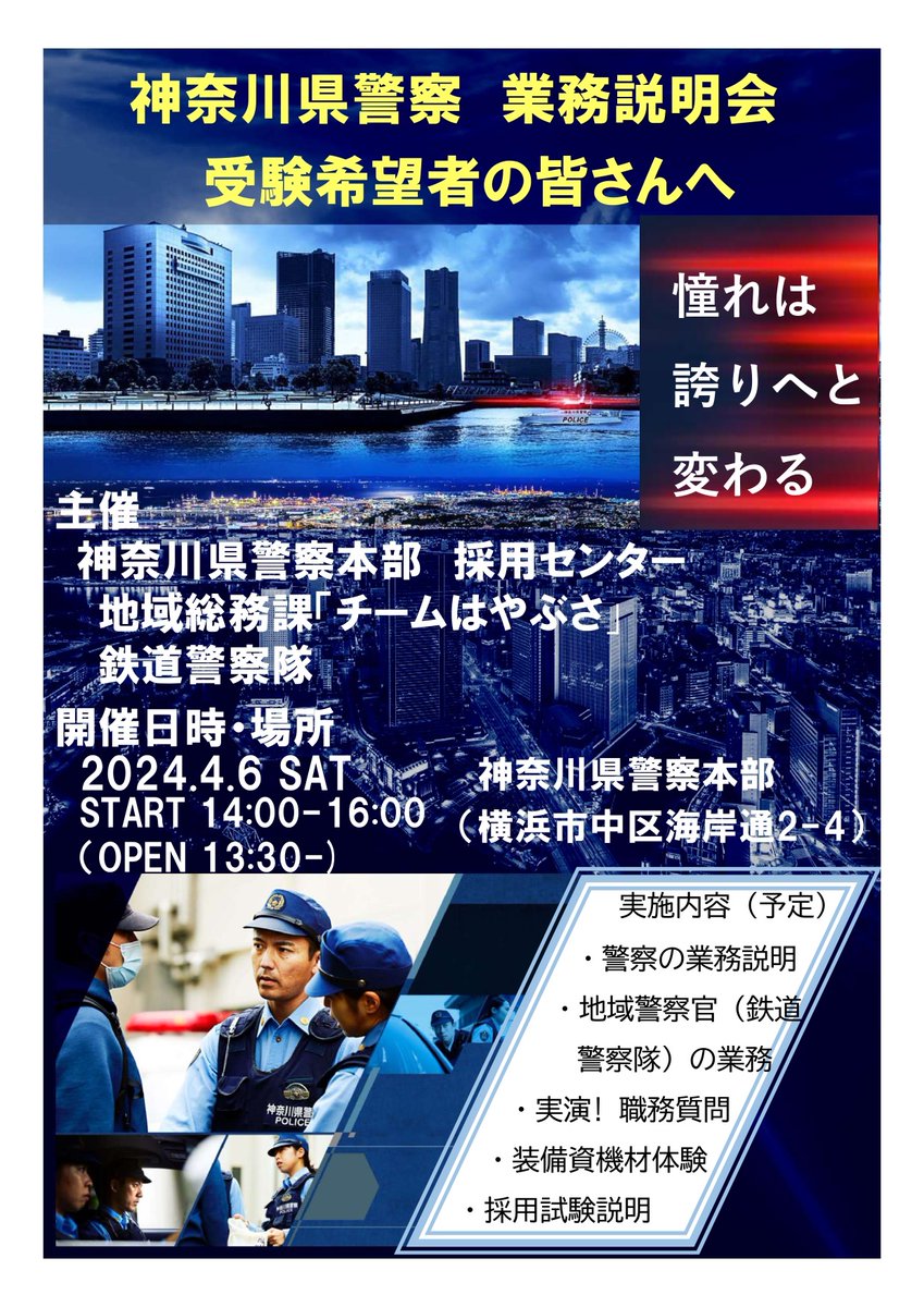 【採用イベント情報】☆地域総務課(チームはやぶさ)鉄道警察隊業務説明会4月6日14時から神奈川県警察本部で説明会を開催するガル!業務説明や職務質問の実演等、警察官から話を聞くチャンス!神奈川県警察採用..