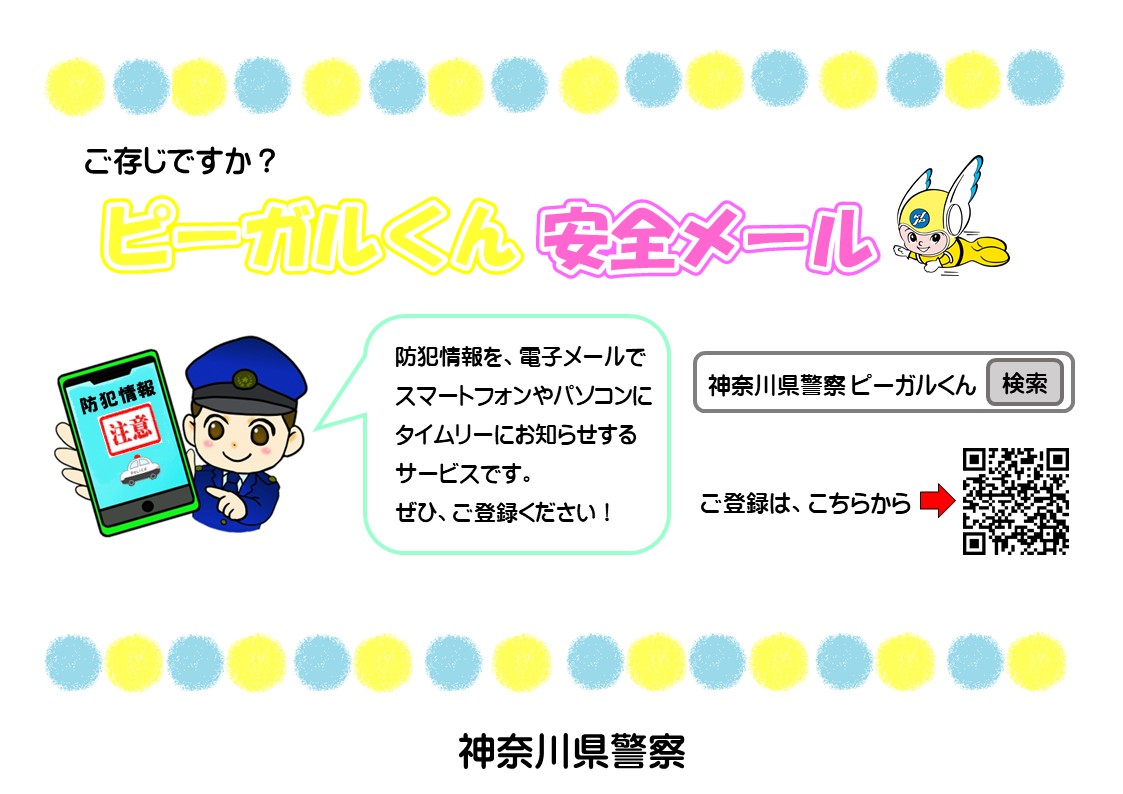 【安全メールに、是非ご登録を】県警では、「ピーガルくん安全メール」という名称で、登録者の方々に電子メールで防犯情報をお知らせしています。7月のリニューアルで、配信情報のカテゴリーが増えました。是非、ご..