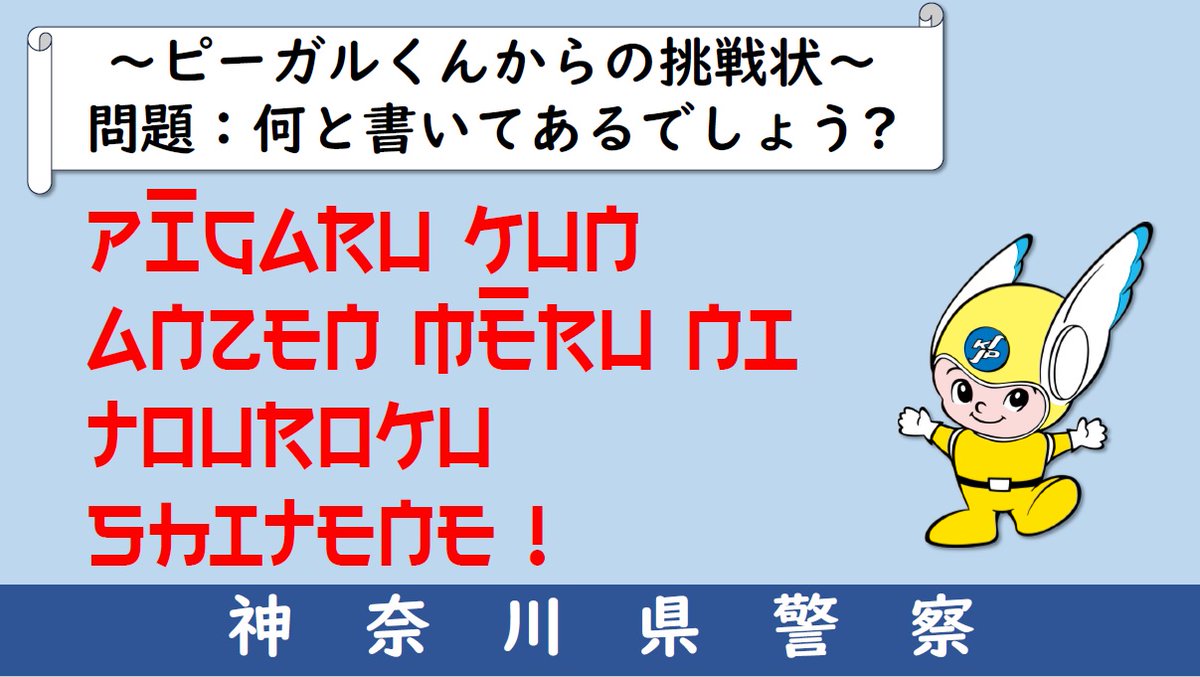 【ピーガルくんからの挑戦状】防犯に関連する暗号クイズを作成しました。是非、お時間がある時に挑戦してみてください。答えは、こちらで確認することが出来ます。https://police.pref.kana..