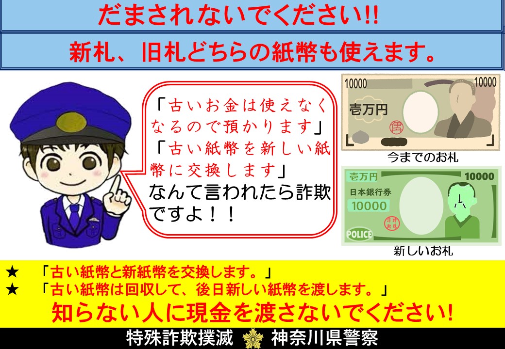 【新札、旧札どちらの紙幣も使えます!】新紙幣、旧紙幣どちらの紙幣も使えます!金融機関の職員等をかたって「旧紙幣は使用できなくなる」「回収して新紙幣と交換する」などの話は、サギです!知らない人に現金を渡..