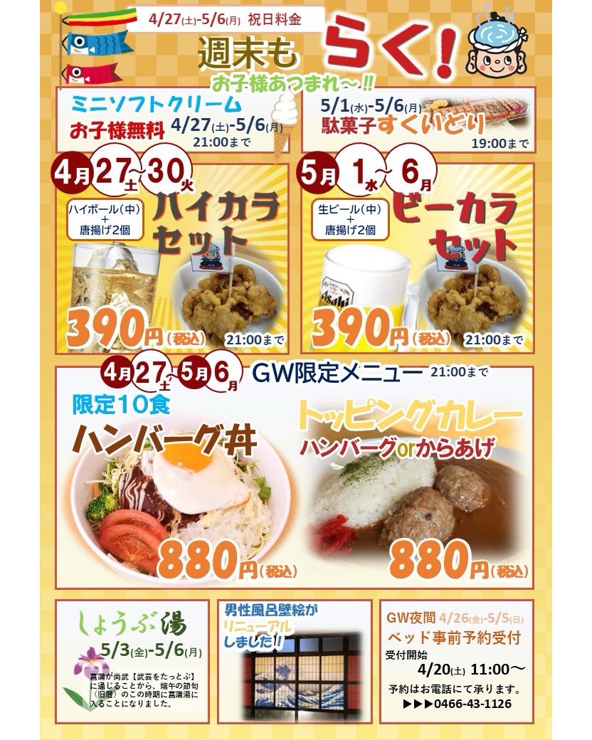 🌸4月後半GWイベント🎏⚫︎ミニソフトクリームお子様無料プレゼント🍦⚫︎駄菓子すくいどり🍭🍫⚫︎ハイカラセット/ビーカラセット🍺⚫︎GW限定メニュー⚫︎しょうぶ湯🍃GWは是非らくへご来館くださいませ😀..