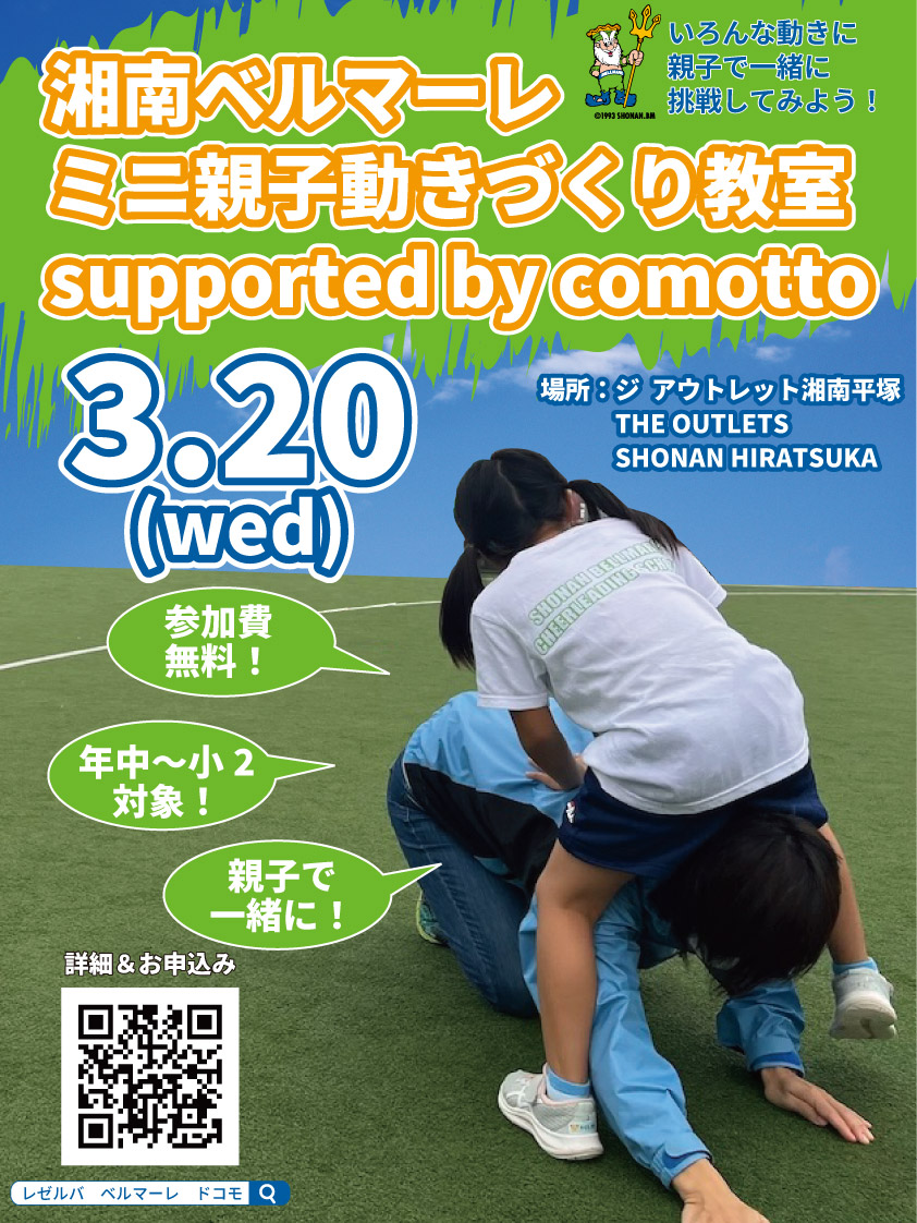 /年中~小学2年生対象👦🏻👧🏻湘南ベルマーレミニ親子動きづくり教室supportedbycomotto開催✨\参加費無料✨3月20日(水)「THEOUTLETSSHONANHIRATSUKA」で開催🛍..