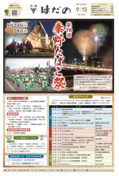 広報はだの9月15日号を発行しました1面は、9月27日㈯、28日㈰に開催する秦野たばこ祭を特集70周年を記念してパワーアップしたイベントが盛りだくさんです4面では、OMOTANコイン街巡りスタンプラリ..