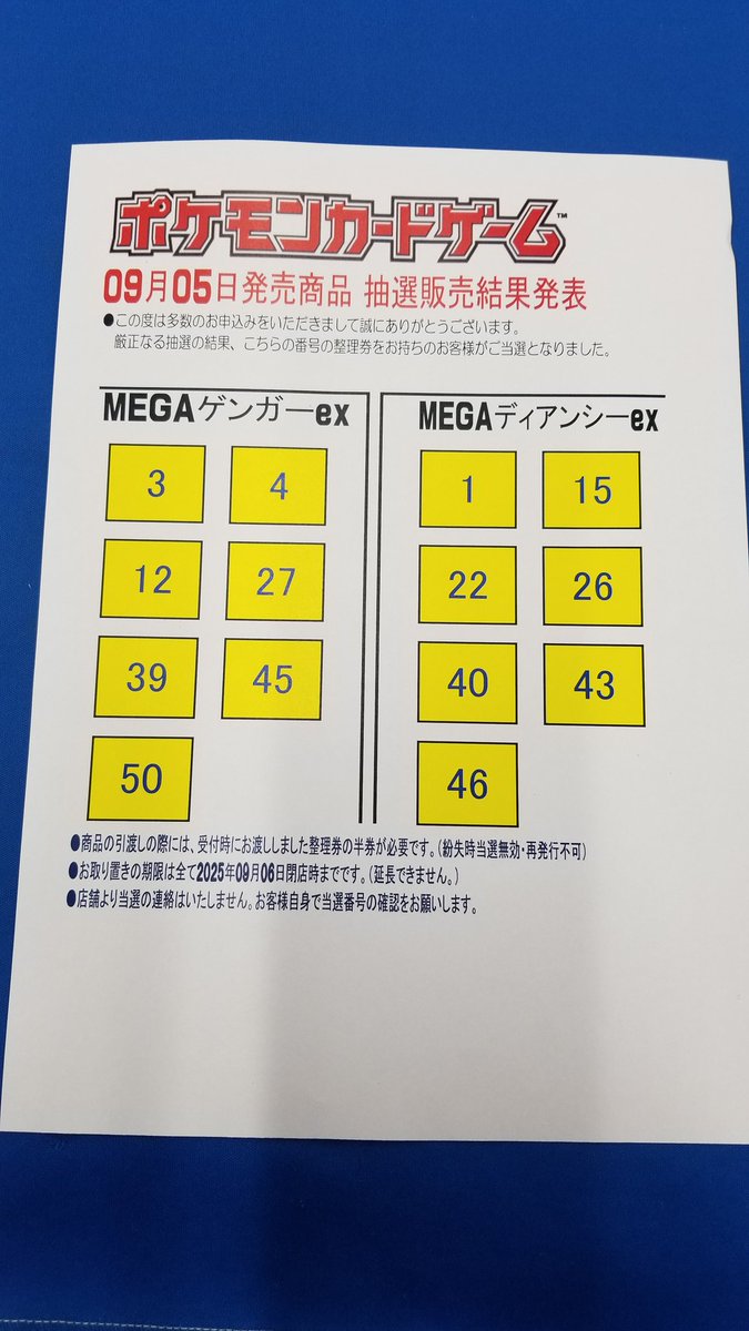 【ポケモンカード】09月05日(金)発売MEGAゲンガーexMEGAディアンシーex抽選結果発表!こちらの番号の整理券をお持ちのお客様がご当選となります。申込受付時の注意事項等をご確認の上、期日までの..