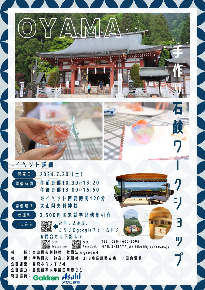 産業能率大学の柴田ゼミの学生さんが企画する手作り石鹸ワークショップが7月20日、阿夫利神社にて行われます。ワークショップの他、神社参拝、茶寮石尊の利用など内容も盛り沢山です。お誘いあわせの上、ご参加い..