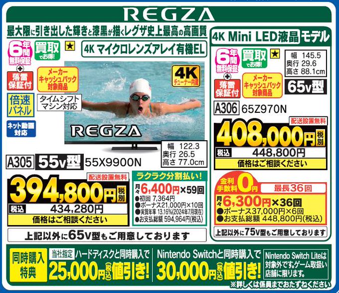 4階テレビコーナーにて《新製品発売特別企画!#REGZAデビューフェア》開催中!レグザ『4K有機ELテレビ』や『4KMiniLED液晶テレビ』新製品が大変お買い得です!※価格は係員までご相談ください♪..