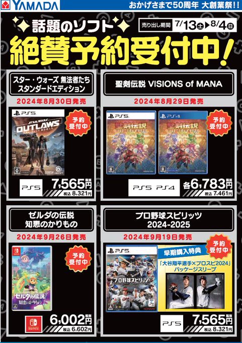 4階ゲームコーナーにて9月19日(木)発売予定の#プロ野球スピリッツ最新作や9月26日(木)発売予定の『#ゼルダの伝説知恵のかりもの』など「ニンテンドースイッチ」や「PS5・PS4」の新作ソフト各種ご..