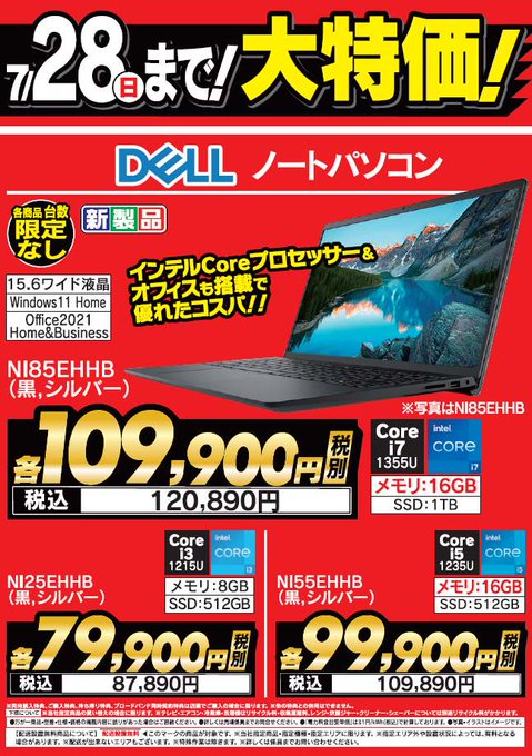 《新店オープン協賛セール》開催中!4階パソコンコーナーでは7/25(木)~28(日)の4日間限定!新製品!インテルCoreプロセッサー&オフィスも搭載で優れたコスパ!#DELLノートパソコン『NI85..