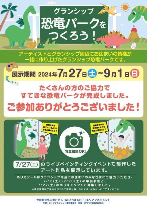《#グランシップ恐竜パークをつくろう!》7月27日(土)に開催された『ライブペインティングイベント』で制作した#アート作品が!2階に展示中♪躍動感のある「恐竜パーク」をぜひチェックしてみて下さい♪詳し..