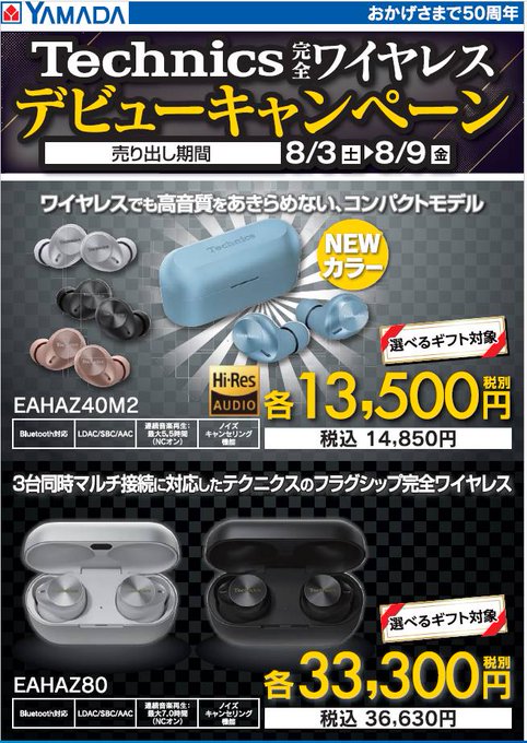 《ヤマダの夏祭り》開催中!4階では『#Technics完全ワイヤレスデビューキャンペーン』実施中!ワイヤレスでも高音質をあきらめないコンパクトモデル「EAHAZ40M2」や3台同時マルチ接続に対応♪テ..