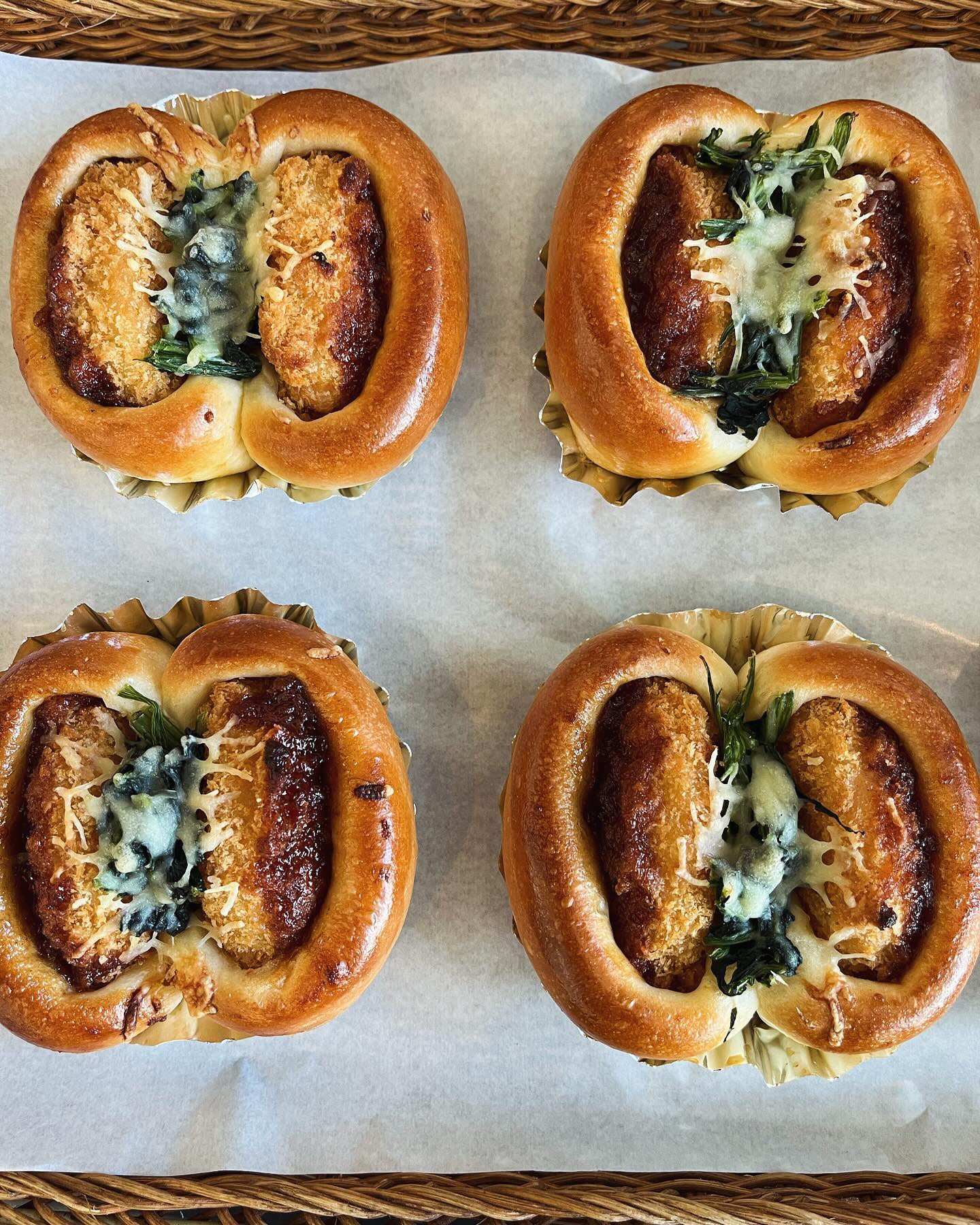 新商品 グラタンコロッケパン(カニ入り)マカロニクリームのグラタンコロッケにほうれん草がトッピングされたパンです。寒い時期にアツアツのグラタンコロッケはいかがですか😋