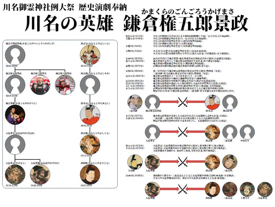 川名御霊神社の例大祭にて歴史演劇を奉納するときに観客や子どもたちに配布する相関説明図奉納演劇「川名の英雄鎌倉権五郎景政」鎌倉党、源氏三代との戦い#鎌倉権五郎景政#御霊神社9月13日(土)13:00から..