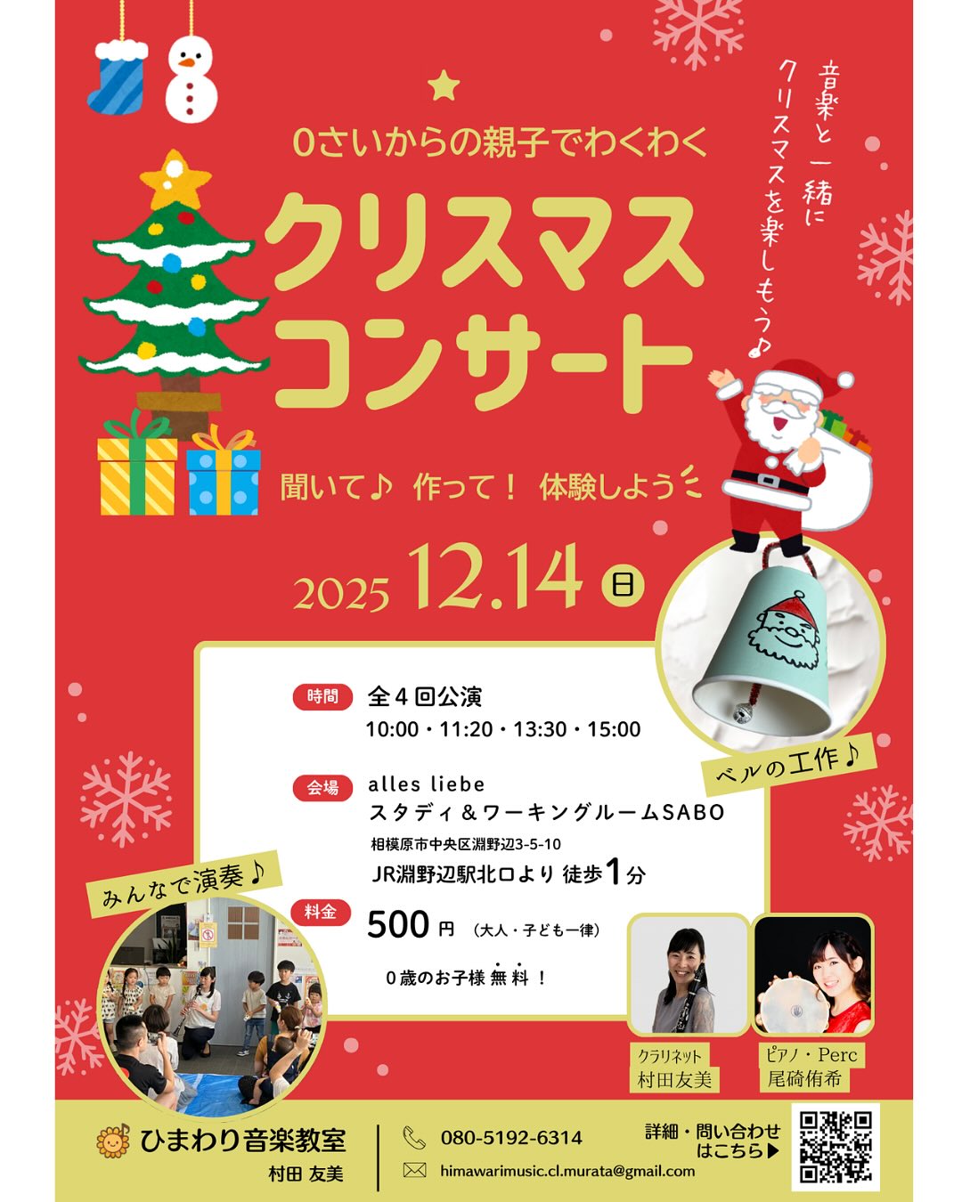 淵野辺駅北口すぐの「スタディ&ワーキングルームSABO」にて、2025年12月14日(日)に「0さいからの親子でわくわくクリスマスコンサート」が開催されます。0歳のお子様は無料。大人や0歳以外のお子