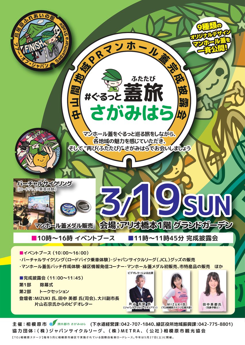 今週末(3/19)、中山間地域をもっと元気にしたい、下水道をもっと知ってほしいとの想いで制作した9種類のマンホール蓋を披露します。バーチャルサイクリングや相模原市のマンホール蓋メダルの全国初販売もお見..