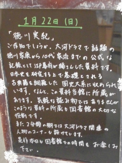【#今日のウェルカムボード】 「徳川実紀」は書庫にて所蔵していますので、閲覧ご希望の際はレファレンスカウンターにてお申し付けください♪ 本日もご来館お待ちしております😌 #相模大野図書館 #どうする家康