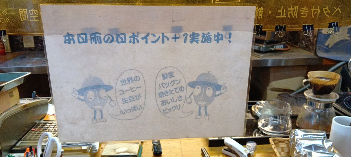 雨が降ってきましたので、セール対象品以外のコーヒー豆のお買い上げの方にスタンプ+1ポイントサービス実施致します。