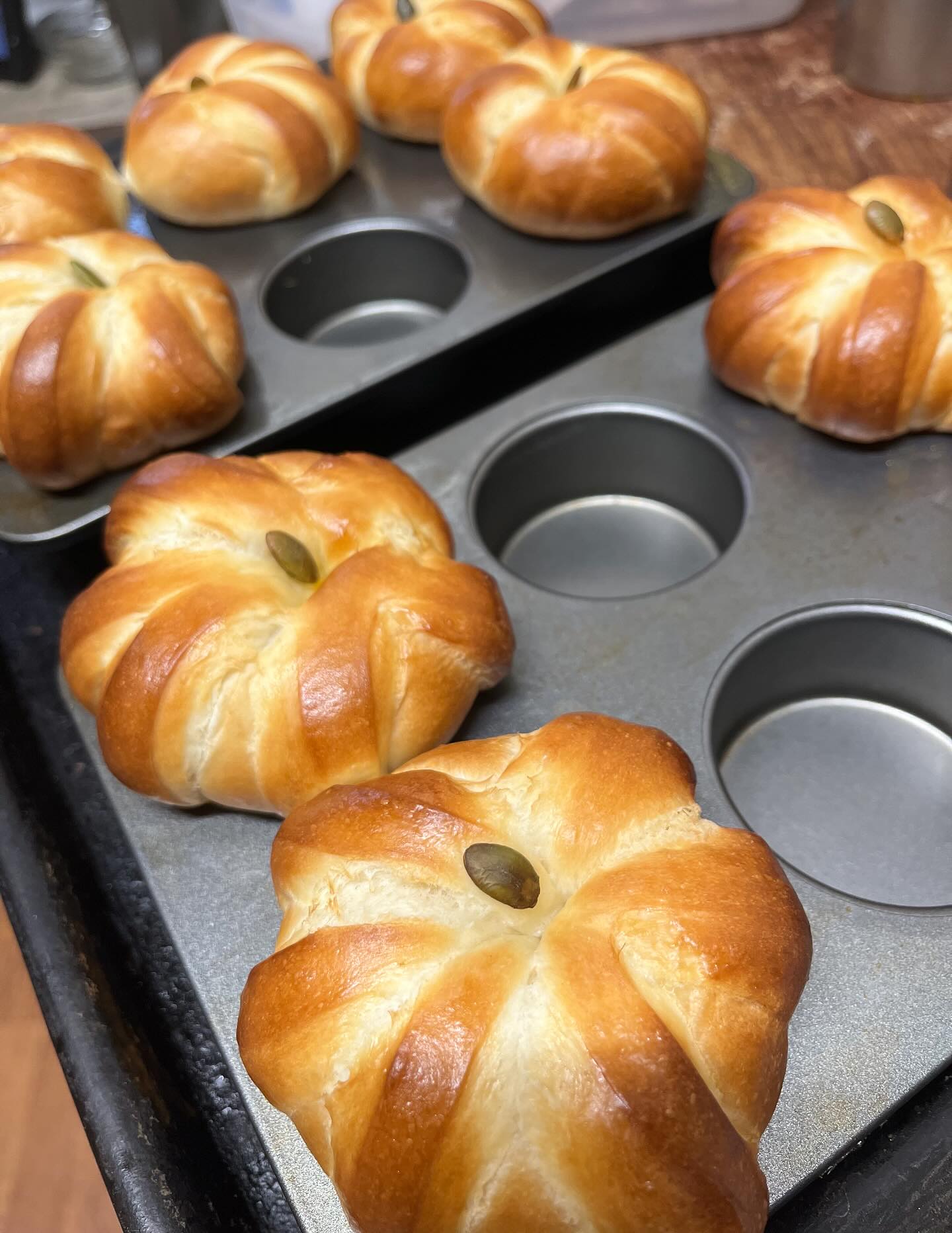パン屋まめくらですかぼちゃパン🎃の季節がやってきました♪中にはかぼちゃ餡がたっぷり入っています見た目..
