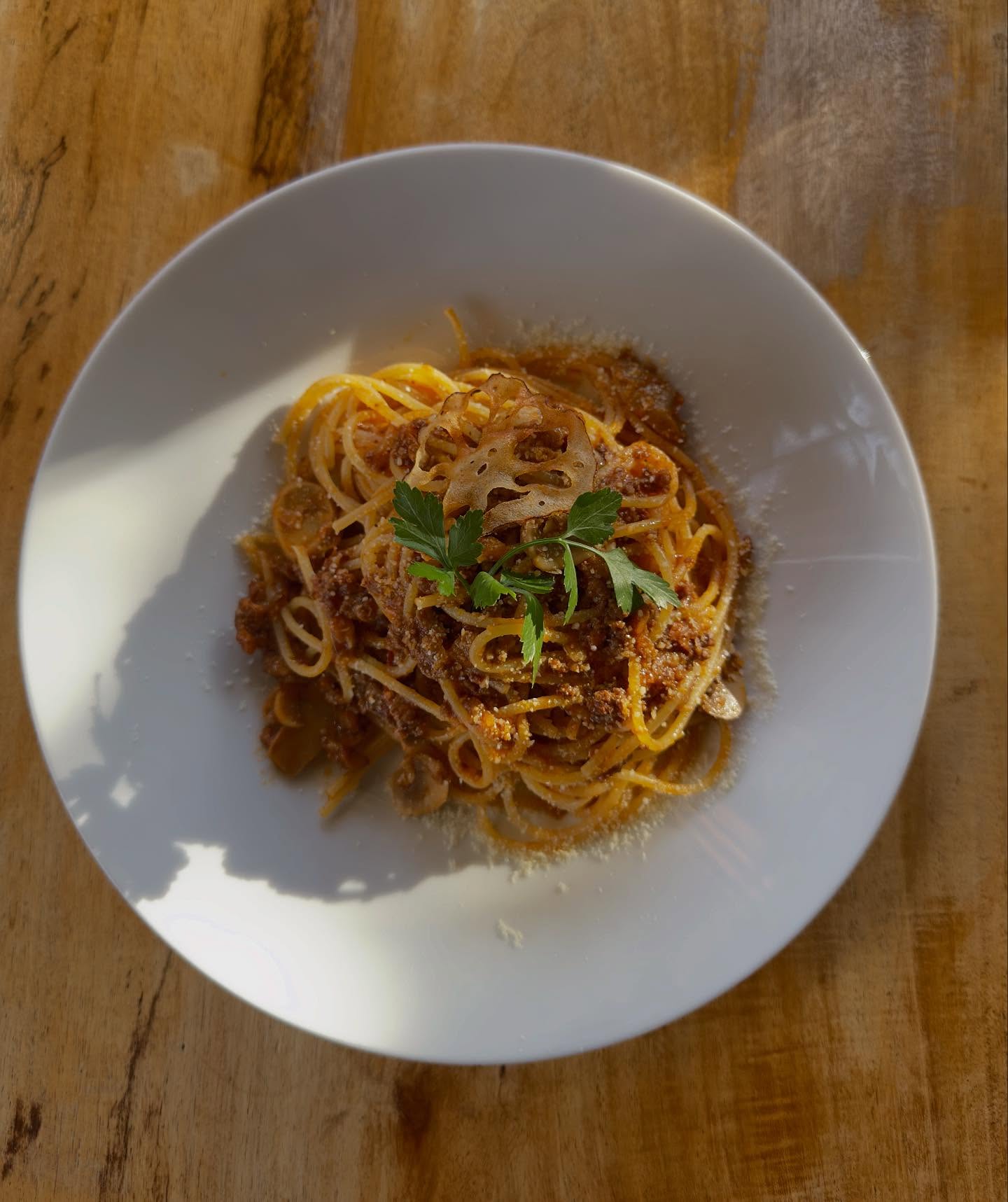 こんにちは🌞ハックルベリーです!📷牛挽肉のミートソースじっくり炒めた玉ねぎと、100%牛挽肉をたっぷり使用。コトコト煮込んで仕上げた、当店自慢の定番メニューです。お子様から大人まで、みんな大好きなミー..