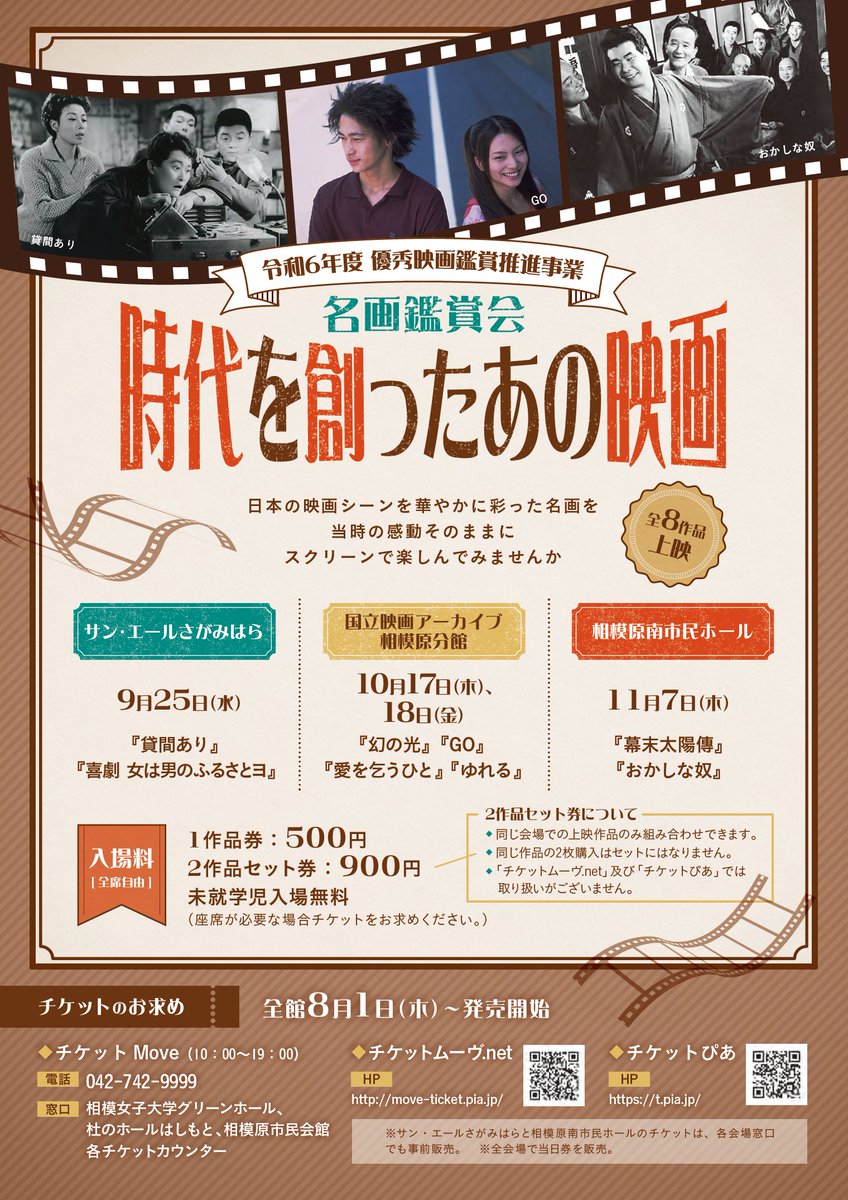優秀映画鑑賞推進事業名画鑑賞会国立映画アーカイブが、所蔵映画フィルムを全国の会場で巡回上映。相模原では、サン・エールさがみはら国立映画アーカイブ相模原分館、相模原南市民ホールの3会場で上映します。