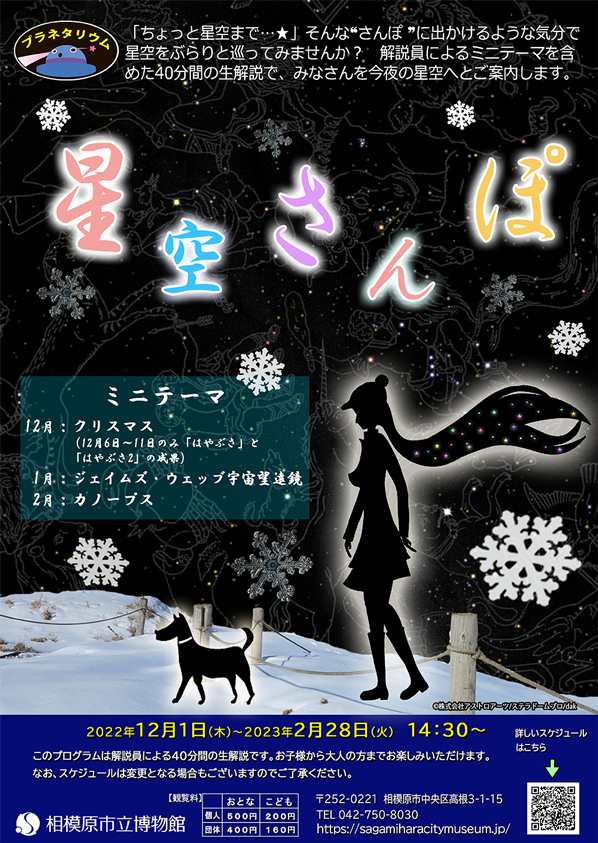 今日(2/2)の#プラネタリウム🌟は14:30【プラネタリウム】星空さんぽ~#冬~ ミニテーマ「#カノープス」🆕16:00【全天周映画】富士の星暦🗻#博物館#科学館#相模原#星座#星空#宇宙#st..