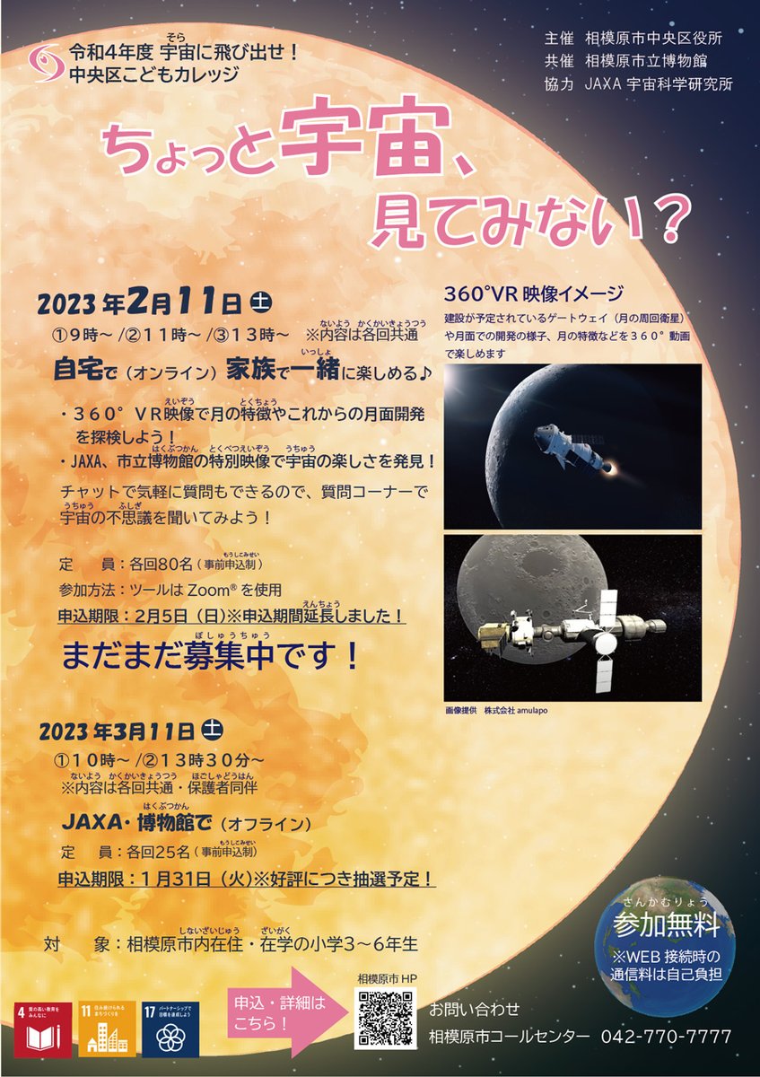 【イベント情報】宇宙に飛び出せ!中央区こどもカレッジ相模原市中央区では宇宙の面白さを体験できるイベントを開催✨今回のテーマは皆既月食やアルテミス計画でいま話題の「月」🌕「市内在住・在学」の小学3~6年..