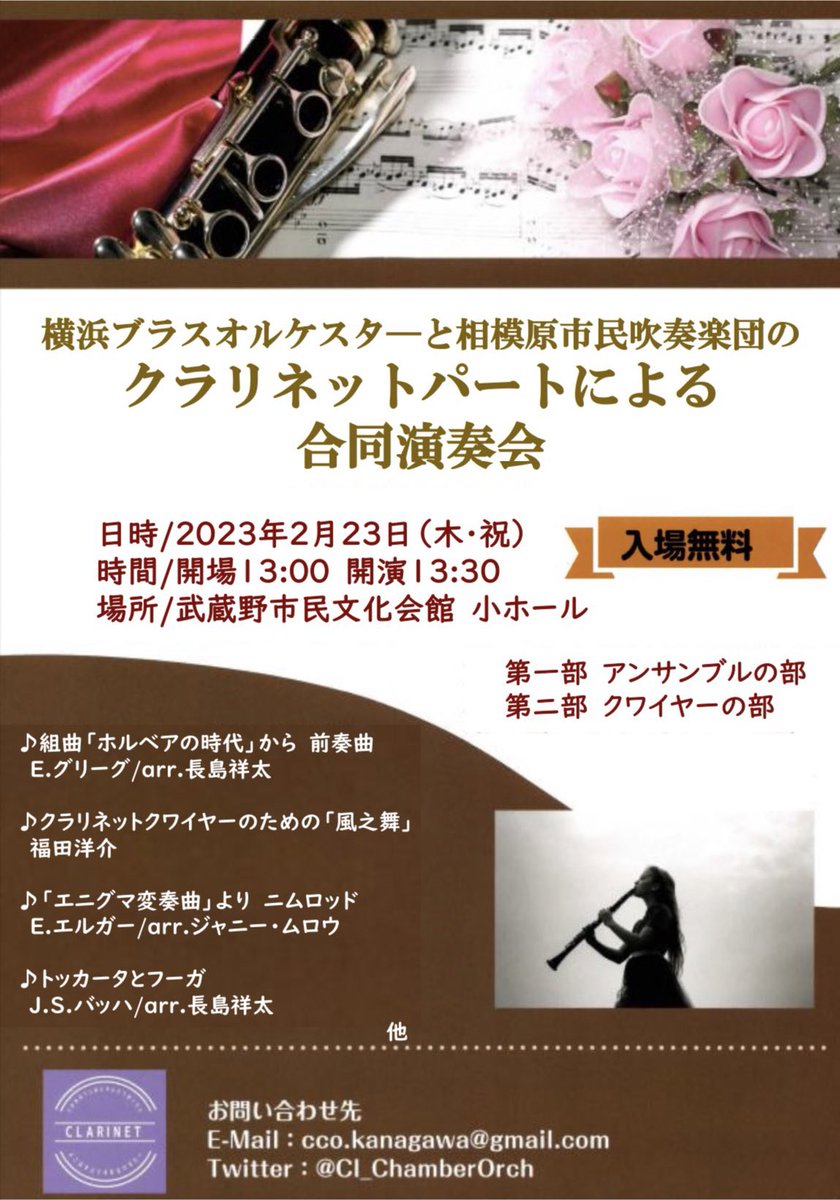 次の演奏会は…横ブラさん(@ybomusic)×相模原市吹のクラリネットパートによる合同演奏会です🤍✨2/23(木・祝)に武蔵野市民文化会館小ホールにて、13:30開演でございます🙌🏻入場無料ですので..