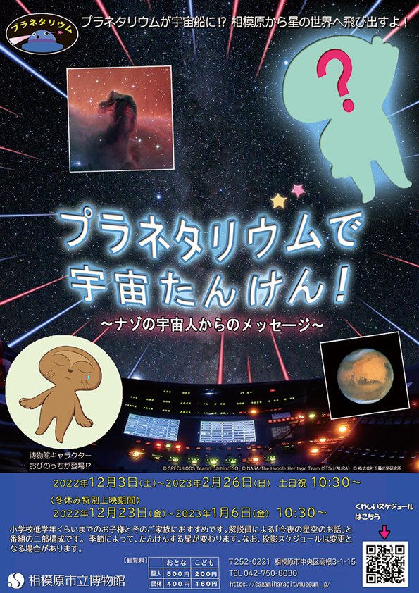 今日(12/13)の#プラネタリウム🌟は14:30【プラネタリウム】星空さんぽ~#冬~ ミニテーマ「#クリスマス🎄」16:00【全天周映画】富士の星暦🗻#博物館#科学館#相模原#星座#星空#宇宙#..
