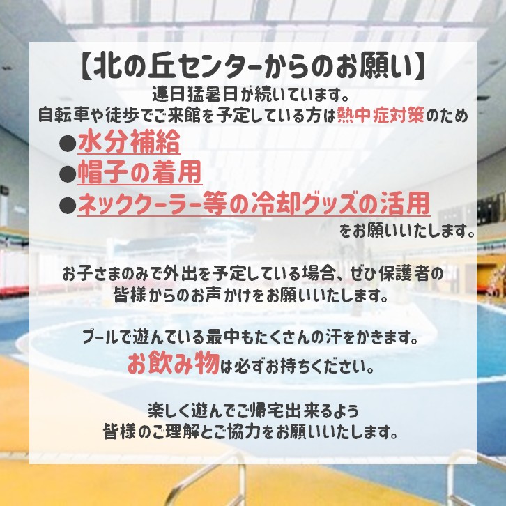 【熱中症予防のお願い】楽しい夏休みも始まり、子ども達は楽しそうにプールで遊んでいます。しかし、連日の猛暑日の影響で熱中症の症状を訴える方が増えてきております。せっかく楽しみに遊びに来ても、熱中症になっ.. 続きを読む