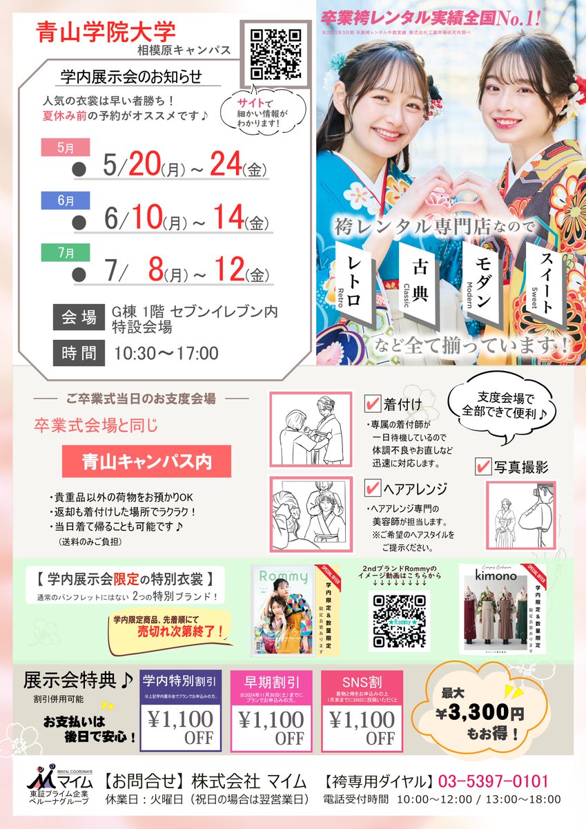 4年生の皆様へ【袴レンタルマイムよりお知らせ】7/8(月)より『卒業袴・学内予約会』がスタートします!今回が『夏休み前の最終回』です!購買会で袴を借りると卒業式当日は「青山キャンパス内にてお支度」が出..