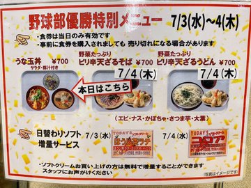 おはようございます(˶˙ᵕ˙˶)ノ”本日7/3(水)の献立です硬式野球部優勝記念セールですが本日は「うな玉丼」となります。明日4日(木)が天ざるうどんそばとなります。POPに明記しておらず大変申し訳あ..