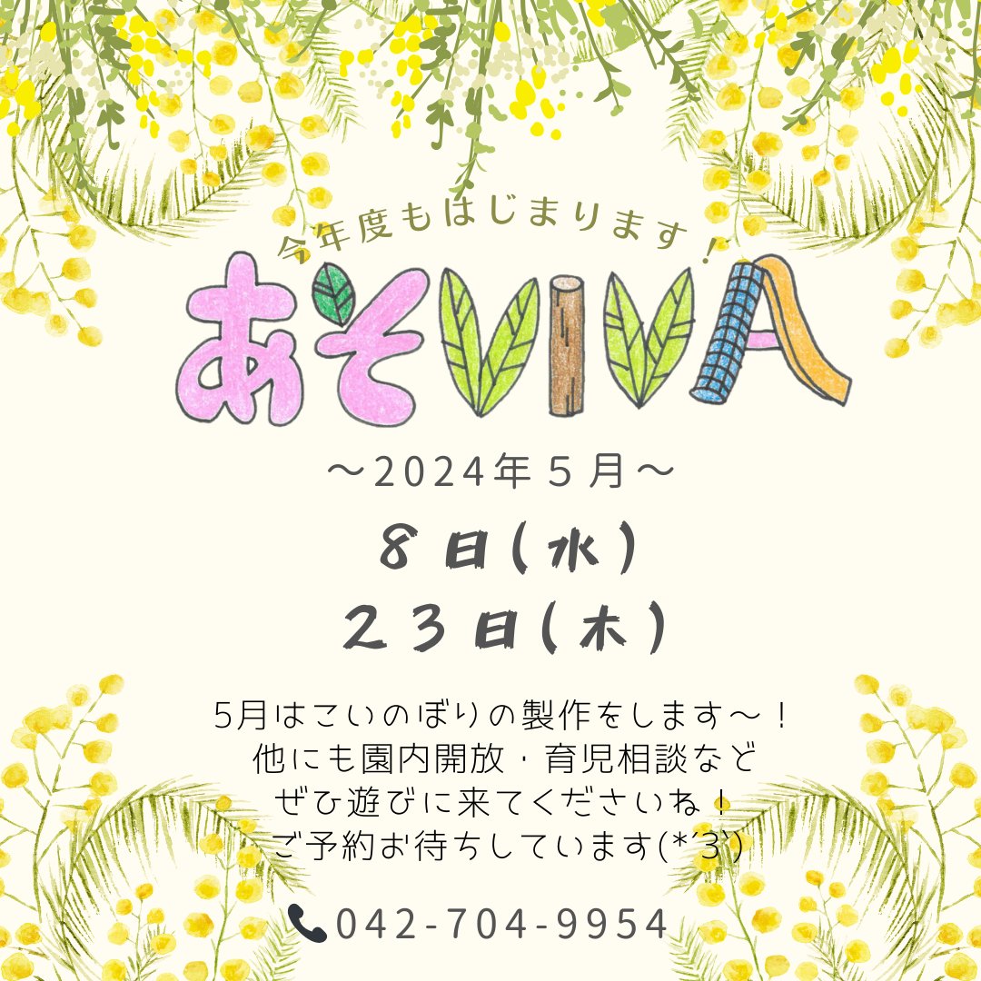 5月のあそVIVAの予定です(*^▽^*)5月はこいのぼりの制作をします~!その他にも園内開放・育児相談などなど・・・ぜひ遊びに来てくださいね!ご予約お待ちしています(´∀`)【TEL】042-7..