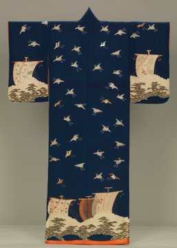 <#女子美染織コレクション紹介>当館が収蔵する振袖をご紹介します。《帆船鶴模様振袖》19世紀2204-0005空に飛び交う鶴の群れと波に浮かぶ帆船が印象的な染織品です。データベースURLhttps:/..