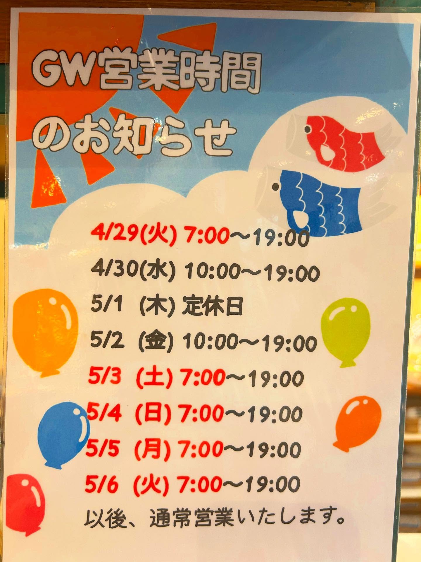 ,📢GW営業時間のお知らせ🎏4月29日(火) 7:00~19:004月30日(水) 10:00~19:005月1日(木) 定休日5月2日 (金) 10:00~19:005月3日 (土) 7:00~19..